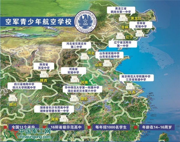 國家教育部明確,河北省石家莊市第二中學、遼寧省沈陽市第一中學、吉林省實驗中學、黑龍江省鶴崗市第一中學、南京師范大學附屬中學、江蘇省南通中學、山東省實驗中學、山東省北鎮中學、河南省實驗中學、華中師范大學第一附屬中學、湖北省武漢市第六中學、湖南省長沙市周南中學、湖南省常德市第一中學、四川省綿陽中學、四川大學附屬中學、陜西省西安中學等16所省級示范高中,為空軍青少年航空學校承辦中學,面向本省范圍招收應屆男性初中畢業生。