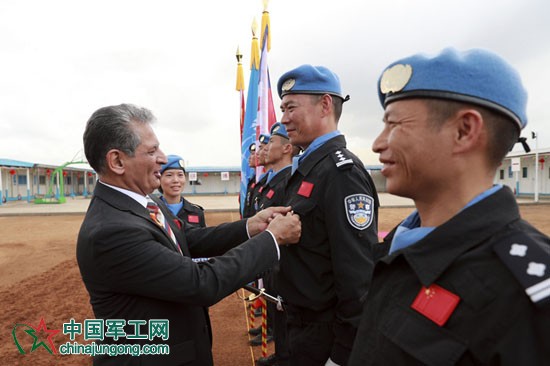 聯合國駐利比里亞特派團(聯利團)11月30日代表聯合國向中國第五支駐利比里亞維和警察防暴隊全體140名隊員授予聯合國“和平勛章”,以表彰他們在維和行動中作出的突出貢獻。