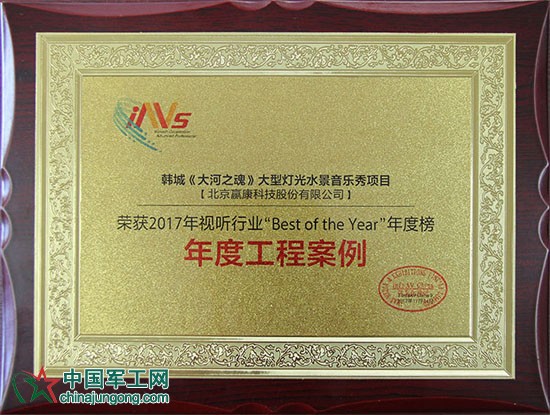 11月24日,由專業音視頻行業媒體平臺《InfoAV CHINA》舉辦的2017信息化視聽行業年度榜單“Best of the Year”隆重發布。贏康憑借“韓城《大河之魂》大型燈光水景音樂秀項目”榮獲年度工程案例獎。