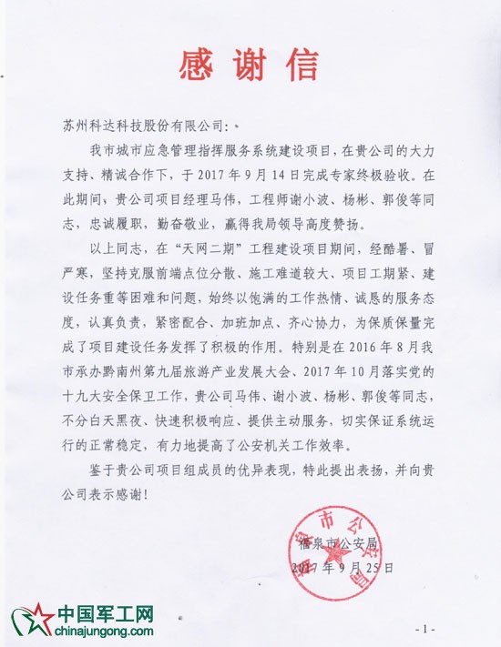 共建平安,智慧福泉。2017年9月14日,福泉市“天網二期”建設項目通終極驗收,專家組給予很高的評價:“福泉市‘天網工程’建設起步晚、推進快、質量高、效果好。”美麗黔南自此有了一張安全新名片。