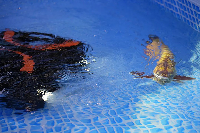 水下展示區,工程師一邊現場操作演示,一邊為大家講解,吸引了許多參觀者駐足觀看,廣受好評。小型觀測級水下機器人 R1-20Li 在水池中運動自如,仿生金龍魚 BG-5 不需要人員操控,可以實現自主避障,在水中優雅地行進,以假亂真,令人稱奇。