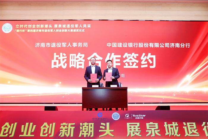 活動期間,濟南市退役軍人事務局與中國建設銀行股份有限公司濟南分行簽署退役軍人創業金融服務項目戰略合作協議。雙方將在金融支持、資源對接、服務保障等方面深化合作,共同構建退役軍人創業創新長效支持機制。