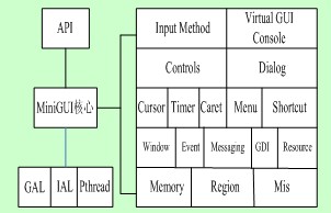 在最底層,GAL(圖形抽象層)和IAL(輸入抽象層)及鼠標和鍵盤的驅(qū)動;中間層是MiniGUI的核心層,包括窗口系統(tǒng)必不可少的各個模塊;最頂層是API,即編程接口。GAL和IAL為MiniGUI提供了底層的Linux控制臺或者X-Window上的圖形接口以及輸入接口,而 Pthread用于提供內(nèi)核級線程支持的C函數(shù)庫。利用GAL和IAL,大大提高了MiniGUI的可移植性,并且使程序開發(fā)和調(diào)試變得更加容易。