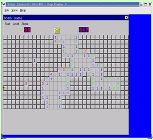 將已下載的mg-samples-1.3.1和mde -1.3.0.tar.gz復制到/opt/emlation/目錄下,在終端下進入該目錄,依次執(zhí)行./configure和make命令,將這些示例程序編譯成能夠在QVFB上可執(zhí)行的程序。首先修改/usr/local/etc目錄下的配置文件MiniGUI.cfg,將gal_engine=fbcon改為gal_engine=qvfb,ial_engine=console改為ial_engine=qvfb。然后使用qvfb&命令啟動qvfb,運行/opt /emulation /mg-samples/src 目錄中的可執(zhí)行程序,如bomb,即可看到運行在QVFB內(nèi)的MiniGUI程序,如圖2所示: