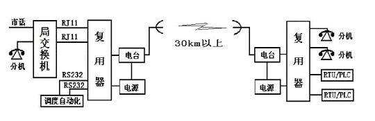 3、 應用之二:點對點及點對多點二話二數鏈路 在25KHz常規單信道中,用全雙工數字電臺及復用器實現二路話音及二路數據傳輸結構如下圖: