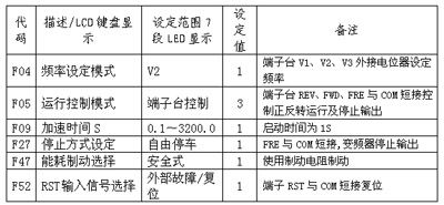 4、變頻器部分功能參數(shù)設(shè)置如下表: