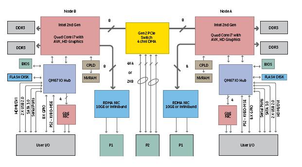 GE 推出了世界上第一款基于 Intel i7 處理器的 OpenVPX多處理板 DSP280, 把高性能計算的技術引入到了信號處理領域, 形成一個新的技術發展方向:高性能嵌入式計算(HPEC)。DSP280 集成兩顆二代4核 i7 處理器(二代 i7支持 AVX), 板載 16GB DDR3 SDRAM, 數據平面對外提供 10GE或 Infiniband 接口, 擴展平面提供 PCIe Gen2 接口。DSP280 的峰值處理能力可達 280GFlops, CPU 節點中間的傳輸速度可達 3.7GB/s, 內存到內存到延遲小于 1us, 原理框圖見下方。 DSP280 與GE 基于二代 i7 的單板計算機 SBC624, 萬兆以太網交換板 GBX460 等產品結合非常容易搭高性能嵌入式計算(HPEC)平臺。