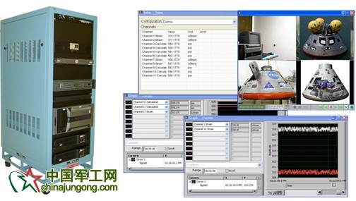 DAS將數(shù)據(jù)記錄至技術(shù)數(shù)據(jù)管理流(TDMS)文件,然后再轉(zhuǎn)移至DDS文件服務(wù)器。 在測試過程中,所有的數(shù)據(jù)都通過網(wǎng)絡(luò)傳輸至用戶,進(jìn)行實(shí)時查看。 圖4顯示了DAS設(shè)備機(jī)架、7個SCXI機(jī)箱其中一個的內(nèi)部情況和用于系統(tǒng)設(shè)置和控制的配置圖形用戶界面。