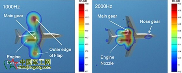 圖6:顯示飛機處于降落設置(放下襟翼,放下起落架,發動機怠速,高度60米,飛行速度60米/秒,水平飛行)時,在1000Hz和2000Hz時的噪聲源
